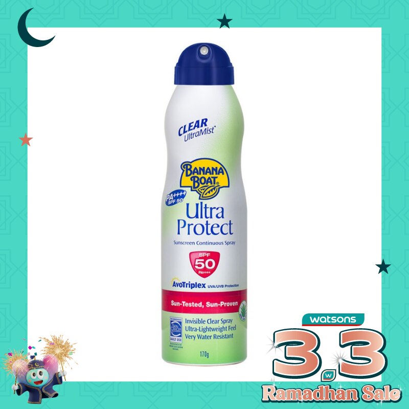 Banana Boat ™ Ultra Protect Sunscreen Continuous Spray dengan teknologi AvoTriplex dapat dengan mudah memberikan perlindungan sinar UVA / UVB dari sengatan matahari dan sinar UV yang merusak dalam semprotan rasa yang terbukti di bawah sinar matahari agar tahan lama dan efektif bila digunakan sesuai petunjuk. Ini juga dicampur dengan Aloe dan Vitamin C & E.