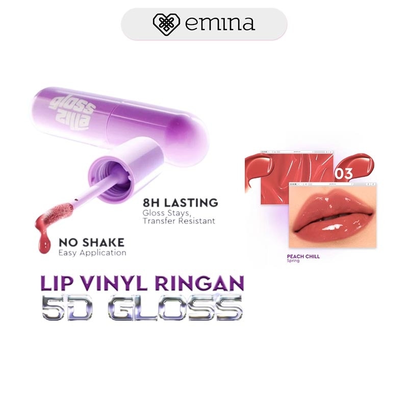 Emina Glosszilla Lightweight Lip Jelly Vinyl merupakan produk lip cream gloss yang hadir dengan 8 varian warna. Diformulasikan dengan Lightweight Film Former Technology, Emina Glosszilla mampu memberikan tampilan 3D jelly gloss di bibir dan tidak mudah transfer, namun tetap terasa ringan dan tidak lengket. Emina Glosszilla dilengkapi dengan kandungan Advanced Hyaluronic Acid, 5+ Oil Complex dan Vit E yang mampu membuat bibir tetap lembab dan nyaman dipakai seharian.