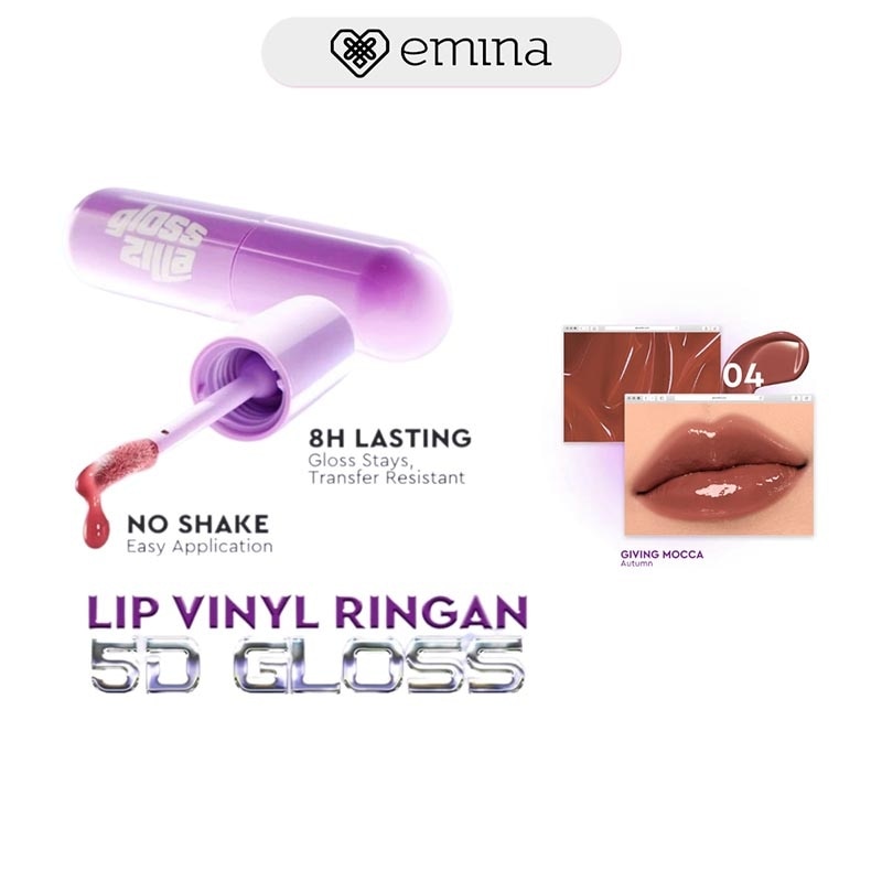 Emina Glosszilla Lightweight Lip Jelly Vinyl merupakan produk lip cream gloss yang hadir dengan 8 varian warna. Diformulasikan dengan Lightweight Film Former Technology, Emina Glosszilla mampu memberikan tampilan 3D jelly gloss di bibir dan tidak mudah transfer, namun tetap terasa ringan dan tidak lengket. Emina Glosszilla dilengkapi dengan kandungan Advanced Hyaluronic Acid, 5+ Oil Complex dan Vit E yang mampu membuat bibir tetap lembab dan nyaman dipakai seharian.