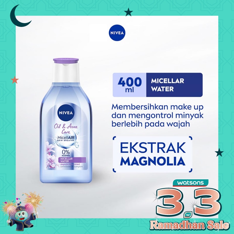 NIVEA Micellar Water MicellAir Oil & Acne Care 400ml. Untuk kulit berjerawat & sensitif mampu buat kulit halus, jauh dari jerawat. Micellar water dengan kandungan Ekstrak Magnolia, membantu mengontrol minyak berlebih pada wajah yang dapat menyebabkan jerawat. Dengan formula Oxygen Boost, mampu membuat kulit wajah terhidrasi dan bebas bernafas. pH balance dan tanpa penambahan alkohol & parfum. Dapat membersihkan kotoran, debu, makeup residu, & bakteri penyebab jerawat pada kulit wajah setelah diusap dengan kapas. Dapat digunakan untuk kulit sensitif dan area sekitar mata. Telah teruji secara dermatologi dan optalmologi cocok untuk kulit. Kulit halus, jauh dari jerawat!