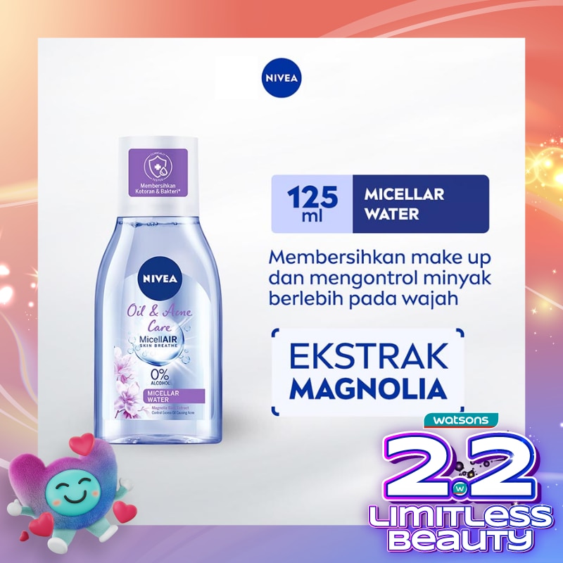 NIVEA Micellar Water MicellAir Oil & Acne Care 125ml. Untuk kulit berjerawat & sensitif mampu buat kulit halus, jauh dari jerawat. Micellar water dengan kandungan Ekstrak Magnolia, membantu mengontrol minyak berlebih pada wajah yang dapat menyebabkan jerawat. Dengan formula Oxygen Boost, mampu membuat kulit wajah terhidrasi dan bebas bernafas. pH balance dan tanpa penambahan alkohol & parfum. Dapat membersihkan kotoran, debu, makeup residu, & bakteri penyebab jerawat pada kulit wajah setelah diusap dengan kapas. Dapat digunakan untuk kulit sensitif dan area sekitar mata. Telah teruji secara dermatologi dan optalmologi cocok untuk kulit. Kulit halus, jauh dari jerawat!
