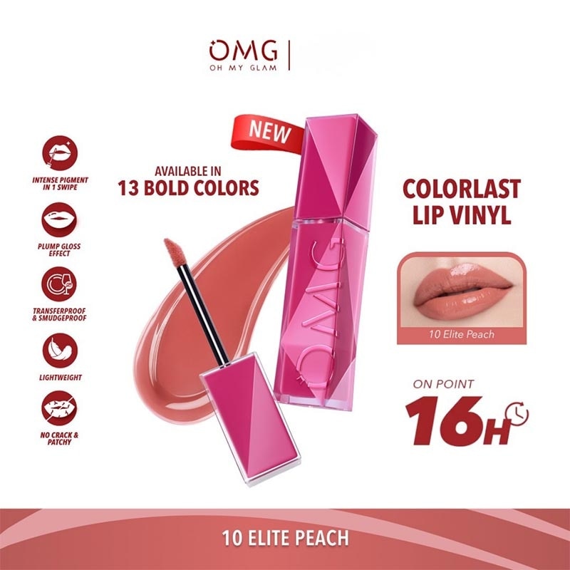 OMG OH MY GLAM Colorlast Lip Vinyl Main Character Edition adalah OMG Lip Vinyl terbaru dengan 5 shades baru untuk para girlboss yang menghadirkan warna persona sweet-bold aura yang cocok untuk berbagai warna kulit wanita Indonesia. Produk ini hadir dengan One Swipe Heartstealing look dengan finish Glossy yang Transferproof. Dengan Color Advanced Tech™ 2.0 menghasilkan warna yang intens dan tahan seharian selama 16H*. Dilengkapi dengan Peptide Complex sehingga nyaman digunakan di bibir. Sekarang hadir dengan 8 varian warna trendy