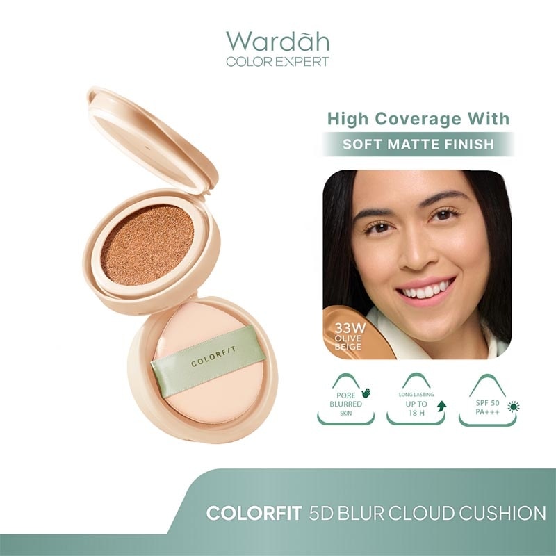 Wardah Colorfit 5D Blur Cloud Cushion adalah cushion dengan tampilan soft-matte yang diformulasikan dengan 5D Pore-Blurring Powder untuk menyamarkan tampilan pori-pori dan tekstur wajah, serta nano-Hyaluron + CICA yang menyerap ke dalam kulit untuk menjaga kelembapan dan kenyamanan. Memberikan coverage yang tinggi, namun tetap terasa nyaman dan ringan di wajah yang tahan hingga 18 jam. Cocok digunakan untuk kulit normal to oily.