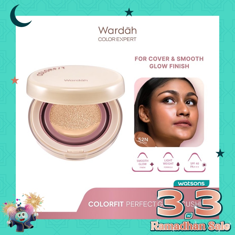 Wardah Colorfit Perfect Glow Cushion paling cocok untuk mereka dengan tipe kulit normal to dry karena mampu memberikan healthy-glow finish yang halus dan tidak terasa berminyak pada kulit. Medium-High Coverage up to 12H, Cushion yang cocok untuk tampilan wajah sehari - hari maupun di momen spesial anda! Humid-Friendly, Lightweight Formula, Memiliki formula yang ringan dan anti-gerah. auto-FIT shades from am to pm! Didukung oleh warna shades auto-fit yang cocok dengan warna kulit anda yang tahan sepanjang hari. Dilengkapi dengan GLOW PERFECTING PIGMENT dan skincare-infused CICA + Hydra -Glucan sebagai advanced moisturizing active yang dikenal mampu memberikan kelembapan 4X lebih baik dibandingkan Hyaluronic Acid biasa. Hadir dalam 14 warna yang sudah dikurasi berdasarkan studi pada kulit wanita Indonesia. halal - non acnegenic - non comedogenic - dermatologically tested - SPF 40 PA+++