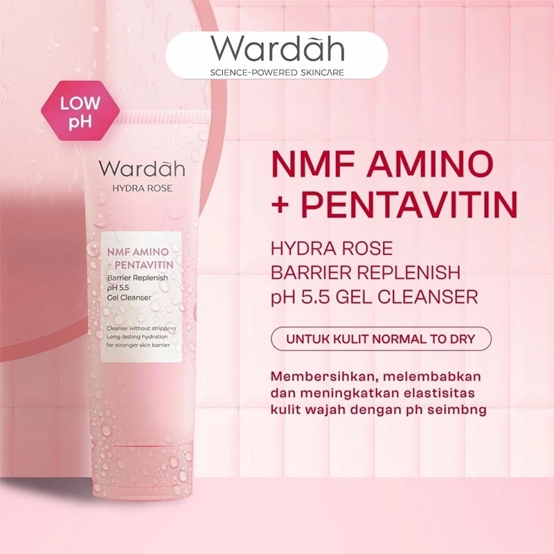 Wardah Hydra Rose Barrier Replenish pH 5.5 Gel Cleanser, face wash dengan Acid Mantle ExpertTM Technology yang diformulasikan dengan NM Amino, inovasi terbaru Amino dari Wardah yang dikombinasikan dengan NMF (Natural Moisturizing Factors) yang membantu menjaga pertahanan acid mantle sebagai garda terdepan skin barrier-mu. Kandungan NMF Amino dan Pentavitin melembapkan kulit dan membantu memperkuat skin barrier. Diformulasikan dengan pH 5,5 yang sesuai dengan pH alami kulit, Wardah Hydra Rose face wash cocok digunakan untuk semua tipe kulit, terutama kulit kering.