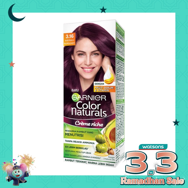 Inovasi terbaru dari Garnier: Pewarna rambut permanen yang menutrisi untuk warna lebih indah dan tetap terawat, tanpa reaksi ammonia dengan wangi yang lembut. Diperkaya dengan bahan-bahan alami berupa 3 natural oils: Avocado, Olive and Almond, juga conditioner dengan fruit vitamins & oils siapapun bisa mendapatkan warna rambut 5x lebih berkilau, terawat dan warna lebih indah. Tanpa reaksi ammonia, dengan wangi yang lembut. Rambut terawat, warna lebih indah.