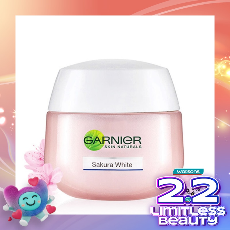 Garnier Sakura White Serum Night Cream Moisturizer Skin Care - 50 ml (Untuk Wajah Cerah & Merona). Garnier Sakura White Night Cream dengan ekstrak sakura alami dan vitamin B3 membantu mencerahkan warna kulit, menyamarkan bintik hitam, dan merawat kehalusan kulit. Bangun tidur dengan kulit putih cerah merona yang terasa lebih halus, lembut, kenyal, dan segar. Formula ini sesuai untuk kulit sensitif. Garnier Sakura White Pinkish Radiance Sleeping Essence adalah night cream (krim malam) yang mengandung 2x ekstrak sakura agar wajah glowing cerah merona saat bangun tidur.