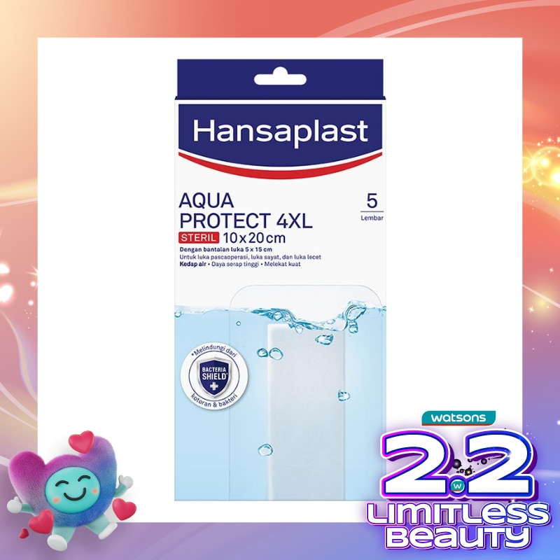 Hansaplast Aqua Protect 4XL adalah plester luka yang kedap air dan steril untuk luka pasca operasi berukuran sedang hingga besar dan luka sehari-hari seperti luka sayat, luka gores dan luka lecet.
