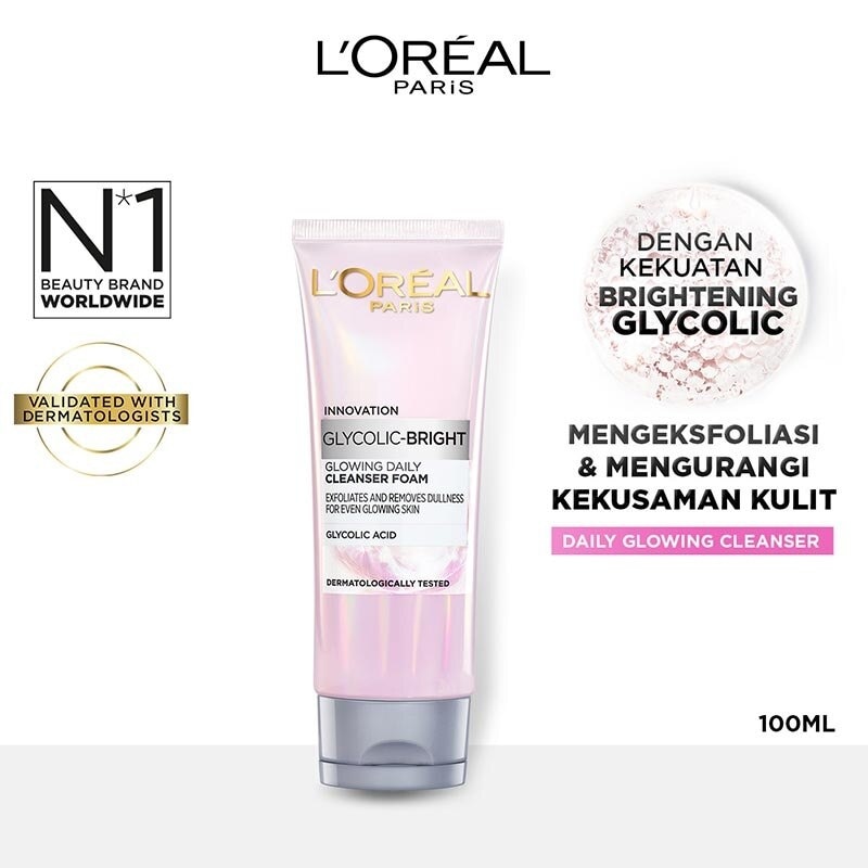 L'Oreal Skincare Laboratories mengembangkan Glycolic Bright Glowing Daily Cleanser Foam untuk mengeksfoliasi kulit secara lembut dan membersihkan lebih dalam. Dengan busa yang lembut dan tebal , membersihkan noda dan makeup secara menyeluruh.
