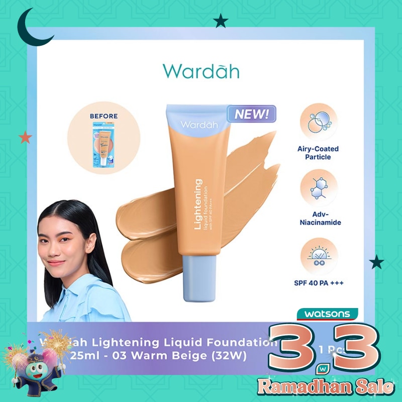Wardah Lightening Liquid Foundation New Packaging . New Improved Formula . Skincare Protection. Setelah lebih dari 12 tahun menjadi produk makeup nomor 1 kecintaan wanita seluruh Indonesia, Wardah mempersembahkan wajah baru Wardah Lightening. The only makeup that gives you a bright ‘no-makeup’ look Kini hadir dengan Airy-Coated Particles™ mampu memberi coverage serba bisa – bisa tampil natural, bisa menutup noda hitam dan bekas jerawat, bisa meratakan warna kulit, bisa tampil flawless – bisa dapatkan semua ini dengan formula super ringan dan menyatu sempurna dengan kulit. Dikemas dengan Advance Niacinamide, SPF 40 PA+++ dan Blue Light Protection yang ampuh berikan upaya terbaik Anti Kusam dengan melawan efek Sinar UV dan Blue Light. Wardah Lightening Liquid Foundation memberikan tampilan kulit flawless dan kenyal. Terlihat fresh sepanjang hari! Halal - non acnegenic - non comedogenic - dermatologically tested - SPF 40 PA+++