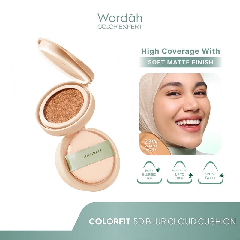 Wardah Colorfit 5D Blur Cloud Cushion adalah cushion dengan tampilan soft-matte yang diformulasikan dengan 5D Pore-Blurring Powder untuk menyamarkan tampilan pori-pori dan tekstur wajah, serta nano-Hyaluron + CICA yang menyerap ke dalam kulit untuk menjaga kelembapan dan kenyamanan. Memberikan coverage yang tinggi, namun tetap terasa nyaman dan ringan di wajah yang tahan hingga 18 jam. Cocok digunakan untuk kulit normal to oily.